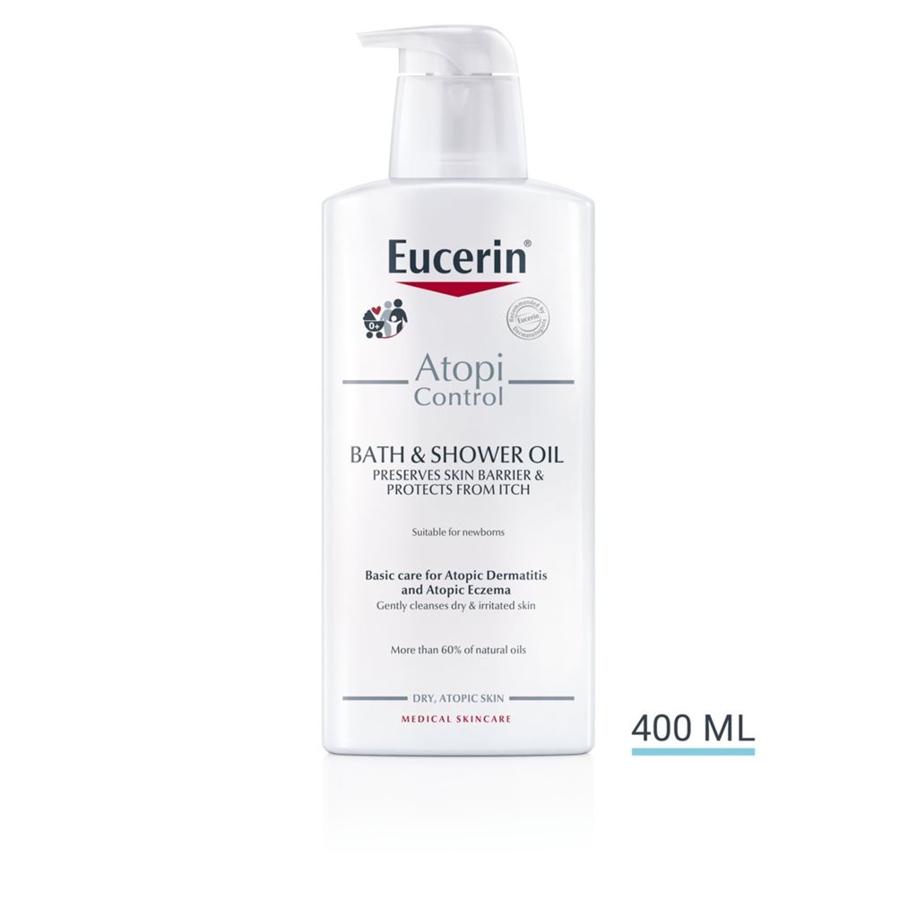 Eucerin AtopiControl Aceite de Ducha no contiene jabón y está enriquecido con una alta concentración de aceites Omega-3 y Omega-6 para limpiar y calmar suavemente la piel con Dermatitis Atópica. El lavado corporal para la Dermatitis Atópica alivia el picor y estimula la barrera natural de la piel. Incluso con un lavado regular, la piel está protegida de una mayor sequedad y picor.