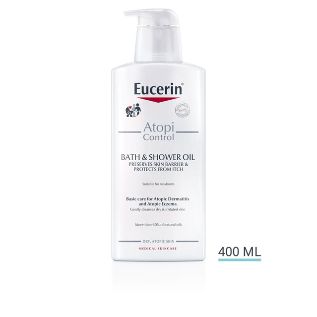 Eucerin AtopiControl Aceite de Ducha no contiene fragancia y es adecuado para adultos, niños y bebés mayores de tres meses.