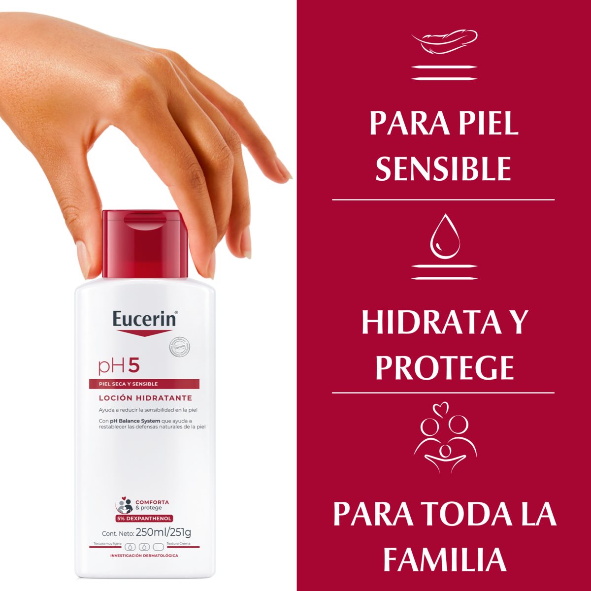 Eucerin pH5 Loción ha sido especialmente desarrollada para las necesidades de la piel sensible del cuerpo. Contiene la protección enzimática pH5 que ha probado clínicamente que activa las enzimas propias de la piel. Fortaleciendo las defensas naturales de la piel desde el interior, esta fórmula única ayuda a restaurar los niveles de pH, apoya la regeneración y repone el almacenamiento de humectación propio de la piel por más de 24 horas. También se probó que previene la penetración del 90% del polen a través de la piel y es, por lo tanto, adecuada para usar sobre la piel con estrés alérgico. Gracias al dexpantenol la fórmula tiene propiedades sanadoras de heridas. Usar a diario para una protección duradera y una piel tersa y suave.